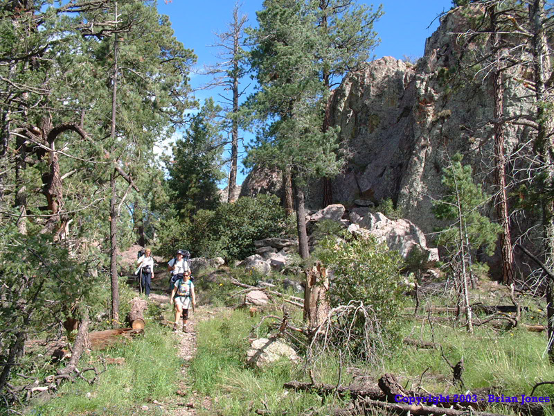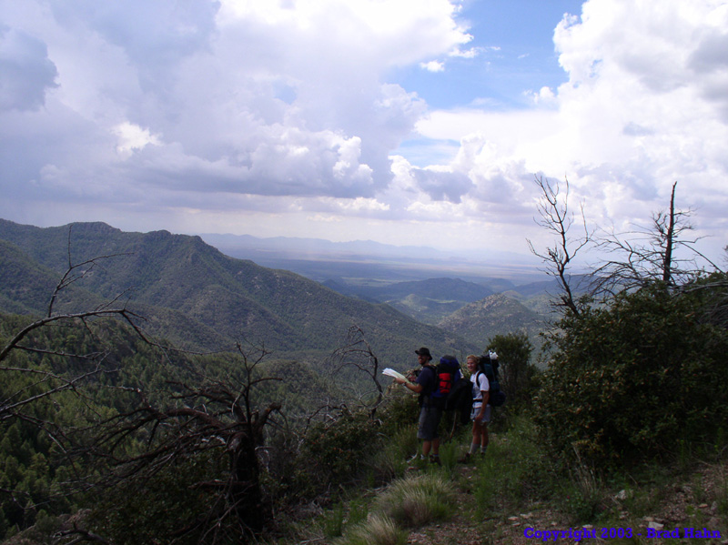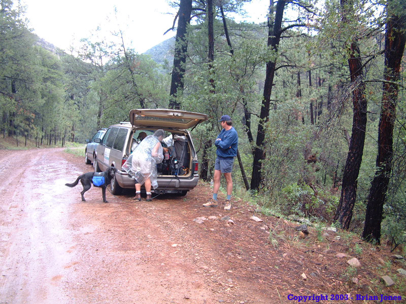 We piled into Lori's van and headed east towards the Chiricahua Mountains. By late morning, we arrived at the Mormon Ridge Trailhead in a light rain. So we donned our rain gear, covered our packs, and slowly got ready for the long climb ahead of us. Our destination: Anita Park. Our starting elevation was around 6150 feet. The elevation at our campsite was 9576 feet. So we had roughly 3500 vertical feet to climb over the course of about 5 trail miles.