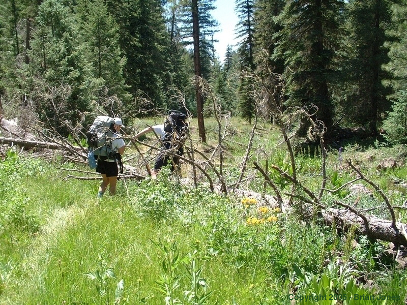Over the Fourth of July weekend, I organized a backpacking trip in the White Mountains. In attendance were, Shan, myself, Brad, Lori, Jeffers, Brian, Kyle, and Chuck, as well as Cherokee (Brian's black dog) and CJ (Kyles yellow dog). All of us coming from Tucson met Chuck at the uppermost Fish Creek trailhead (marked only with a large cairn at the road, and with a sign a short ways down the trail) at around 12:30 Saturday afternoon. We ate lunch and chatted while slowly getting our gear together.