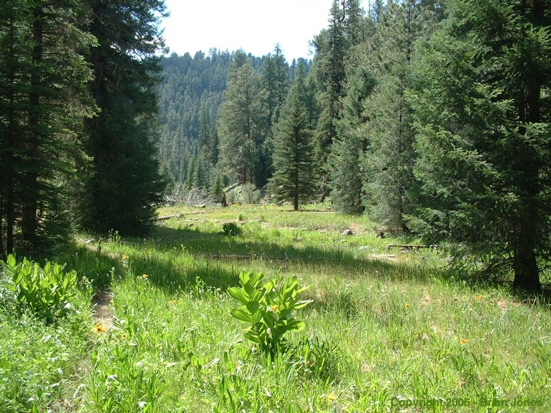 Along the way we saw a number of squirrels, birds, a couple of garter snakes (I think they were Checkered garter snakes (Thamnophis marcianus), but this area was a little high for that species), and a couple of elk. We stopped a great deal on the way down, not only to enjoy the beauty, but also because people were out of shape and needed breaks, so it was after six o'clock by the time we stopped to set up camp about 7 miles down Fish Creek.