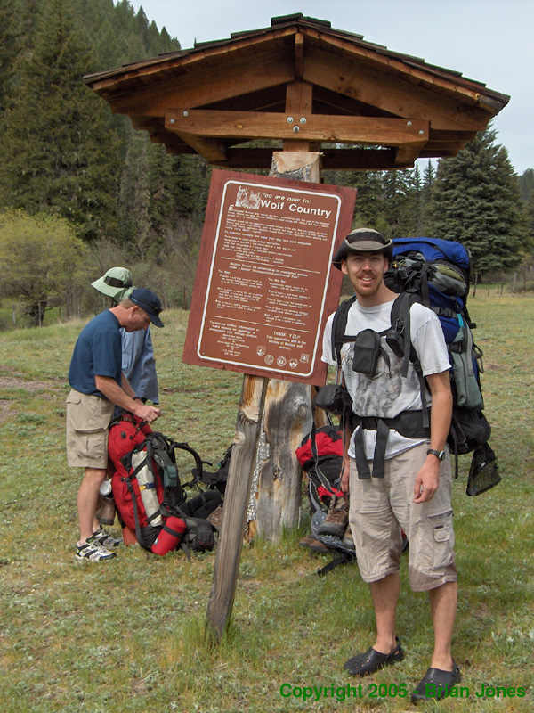At that point we discovered that the trailhead is on the other side of Willow Creek, which was flowing pretty swift and cold. So once we got our gear all ready to go, we put on our sandals and waded across the Willow Creek, then another smaller creek before donning our boots for the climb into the Gila Wilderness. Once again, I encountered my favorite sign. Wolf Country!
