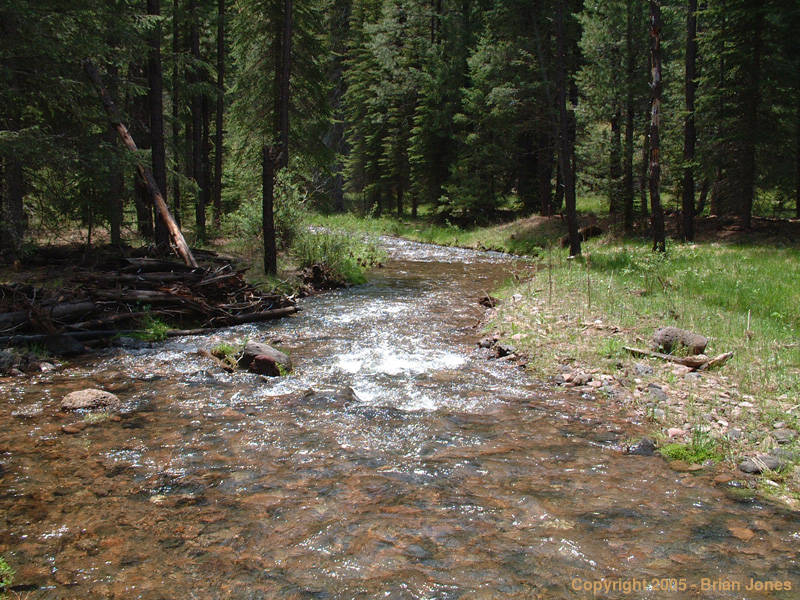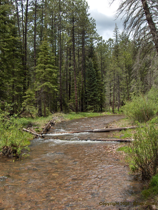 We quickly descended into the Iron Creek watershed (726400 E, 3695900 N), which is an idyllic little place, as the creek drops clear and clean over rocks and fallen logs down to the Middle Fork of the Gila River. The ponderosa pine forest in the Gila Wilderness is refreshingly healthy, and I imagine much like it was before logging so severely altered much of the other ponderosa stands of the southwest. For the most part, the trees are large and spaced well apart, with various grasses and wildflowers below them.