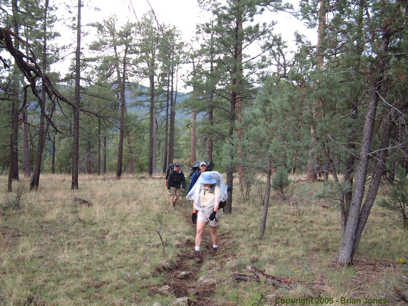It was steep, but fortunately it was fairly brief. Once on top of the mesa, we had the pleasure of excellent views. We also saw the clouds rolling in. And shortly thereafter heard the thunder and saw the lightning. While crossing Clayton Mesa it started to drizzle, then the weather alternated between moderate rain and mere misting.