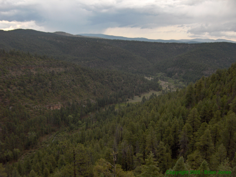 I gave Shan my parka and got out my coat, which at least offered some protection from the rain, despite not being completely waterproof. Eventually we made it to the end of the mesa and then looked down on the confluence of Iron Creek and the Middle Fork of the Gila River (734500 E, 3696750 N). What a gorgeous sight that was!