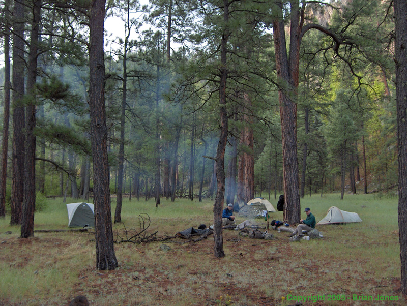 The terrain between the mesa and the grassy confluence where we intended to camp was steep, to say the least. The descent was made by course of long winding switchbacks. But eventually we made it down and found ourselves in the company of two other groups of backpackers. We opted to head downstream a ways to get as close to out of sight and out of earshot as we could (734850 E, 3696900 N). We found an excellent camp site with a nice fire pit and wood already piled up next to it. Below are some pictures of it from the next morning.