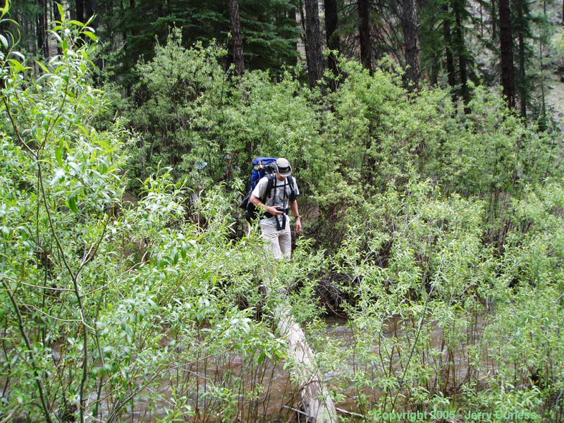 The trail stayed on the north side of Iron Creek until the very end. At that point we had to find a way across without getting our feet wet. Jerry found a small log across the creek and hustled across. I went next, more tentatively. Estevan tried next but didn't make it out of the trees before falling off the log, so he ended up just running across the creek and got his feet wet. Shan was too scared of falling off the log to cross with her pack, so I went back and brought her pack across the creek, then she followed after me.