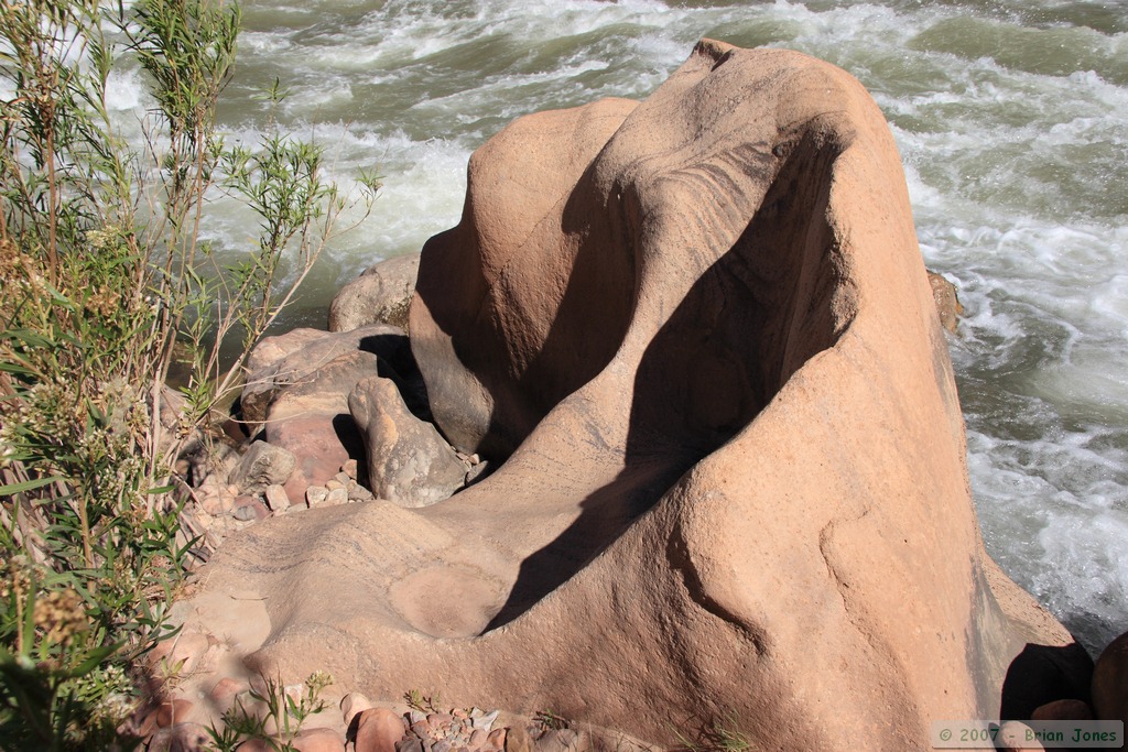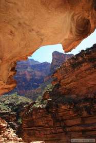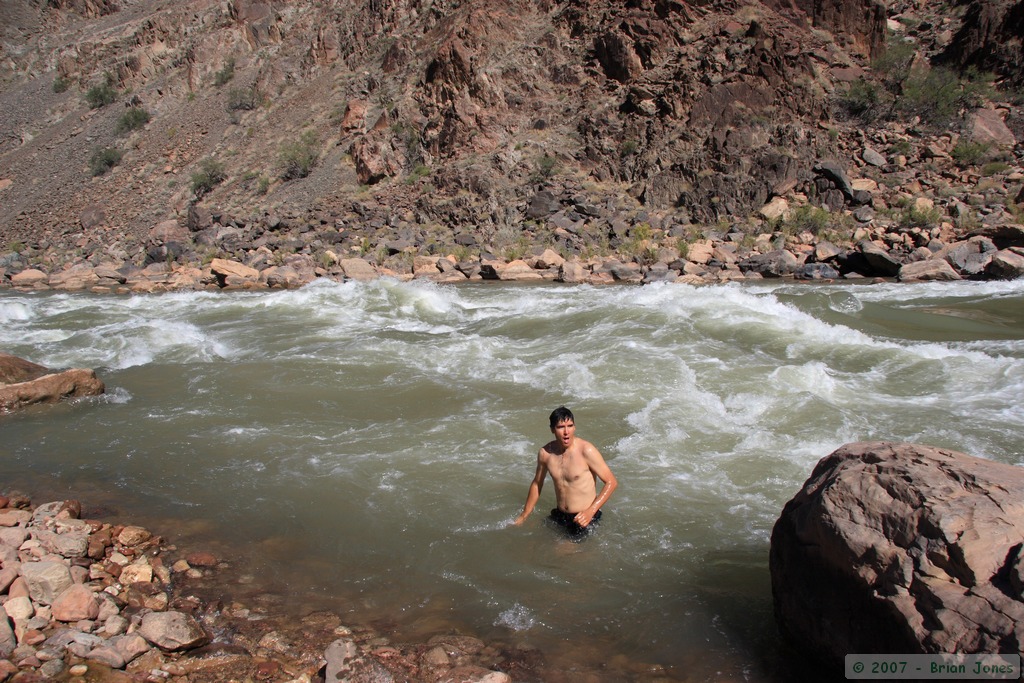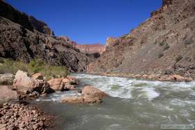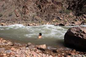 We reached Hermit Rapids at around 10:30 and sat around simply enjoying the view, hoping to see some river rafters come by and run the rapid. In the meantime, the women found a nice boulder to sit on for some "girl talk" while I studied the rocks and Steve, being the wild and crazy guy that he is, went for a bracing (albeit brief) swim in the cold waters of the Colorado River. Because the water for the Colorado River through the Grand Canyon is supplied from the base of a dam, it is about 47 degrees fahrenheit year-round. Steve dove in several times, much to my amazement.