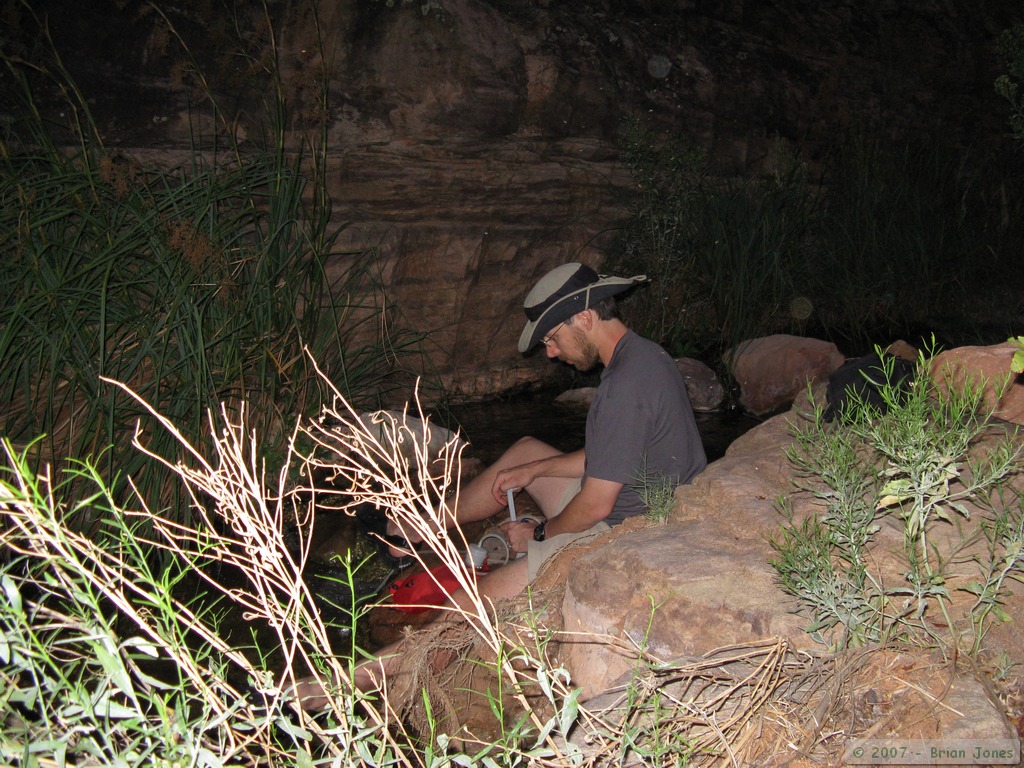 After dinner, we all sat around chatting for a bit, then I went down to my spot on the creek to filter enough water for the following day. It was wonderful to just sit by the creek for a while. I don't know why I love it so much, but I'm rarely more contented than while filtering water in the back country. Almost before I was even done filtering, everyone started turning in for bed, even earlier than Monday night! So I stayed at camp long enough to tuck Shan in then took my camera, notebook and field guide for another little excursion up canyon. This time I opted to stay down close to the creek and see what kind of night life I could find, since my travel companions were providing none.