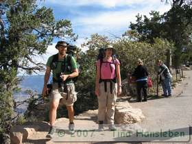 Sometime before ten o'clock, we reached the rim, perhaps 10 minutes behind the rest of the group. A kind woman offered to take our "end of the trail" photo, then we hiked with gusto to our awaiting vehicles. This flat ground stuff is easy! And only a few tourists passed out as we passed by. I'm sure it had nothing to do with our smell after five days in the back country.