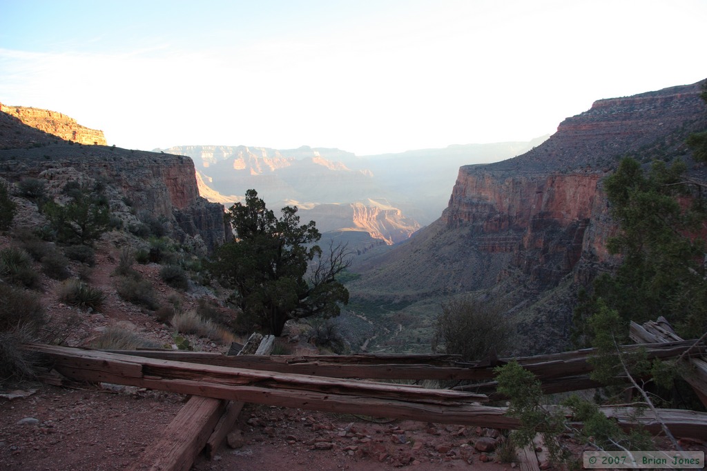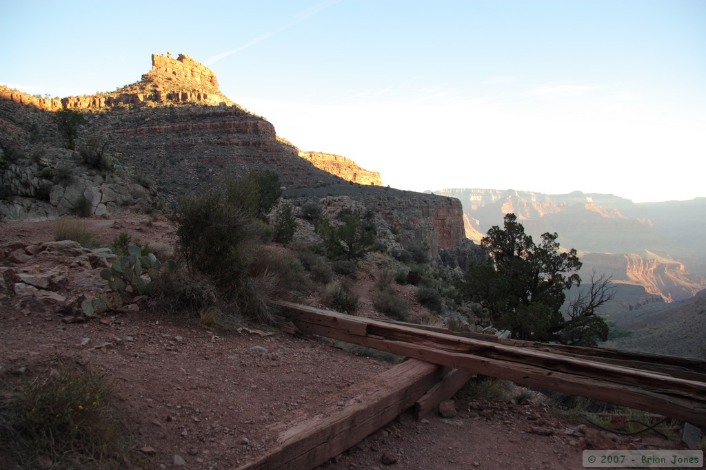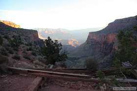 I made it from Indian Garden to 3 Mile Resthouse (about 1.5 hiking miles) in about 35 minutes. I then roamed around the area and waited for everyone to catch up. The view from the area around 3 Mile Resthouse is really nice. Behind the resthouse itself a little ways are some heavy timbers that look like they may have been a part of an old mine or something. They may have simply been something constructed for the early tourism business in the Grand Canyon though. After exploring the area for a bit, I went back to the rest house to see if everyone had made it up. It was too early for Shan to eat breakfast yet, but we convinced her to eat something anyway, as she would need a lot of energy for the climb out. In the end, she probably should have eaten more and earlier. While she ate, we chatted, then headed on up the trail.