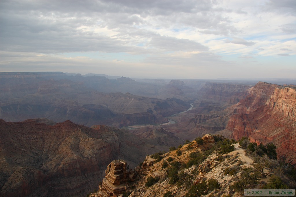 I would have actually enjoyed watching the day fade and the light change on the Watchtower, but I also wanted to go see an evening ranger talk on "River Stories" at the Shrine of Ages, and we needed to get back in time to eat dinner before the talk. Back at the hotel, we gathered Tina up and all four of us went to dinner at Maswik Cafeteria then took the shuttle to Shrine of the Ages for the evening program. The shuttle driver was a real ham, and had the whole bus laughing as he warned us about getting off at certain stops because of the roving gangs of squirrels. He also told us that a couple days prior, a mountain lion had been seen by a bunch of folks right near the Village. I spend tons of time in the back country and I've never seen a live mountain lion, and some people show up to take pictures from the rim and get to see one. Ah well, I've seen wonders they can't even dream of.