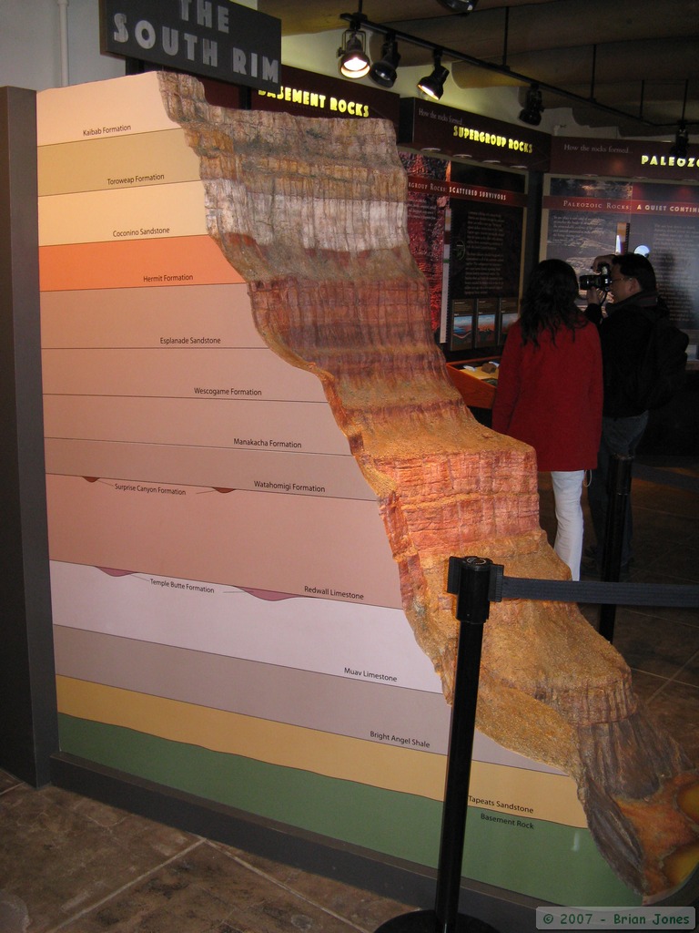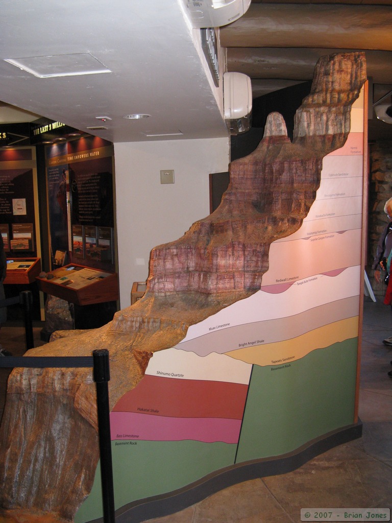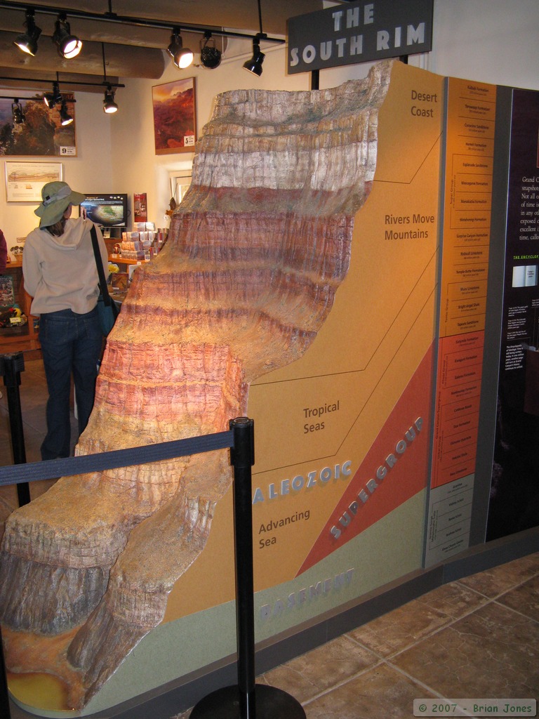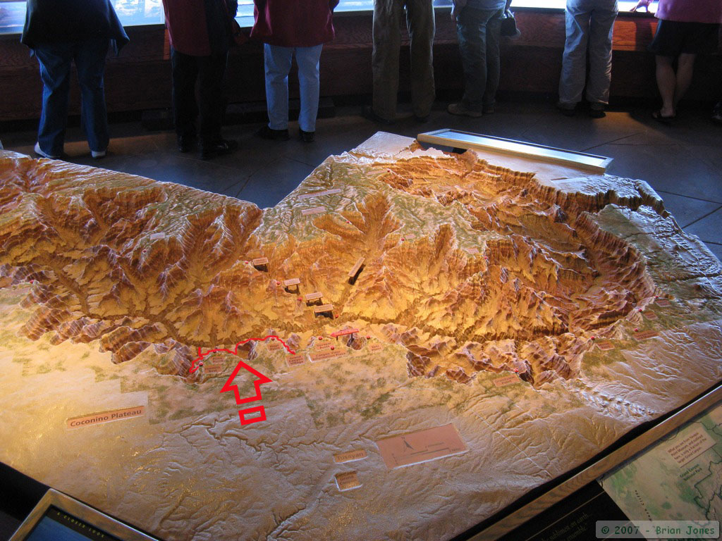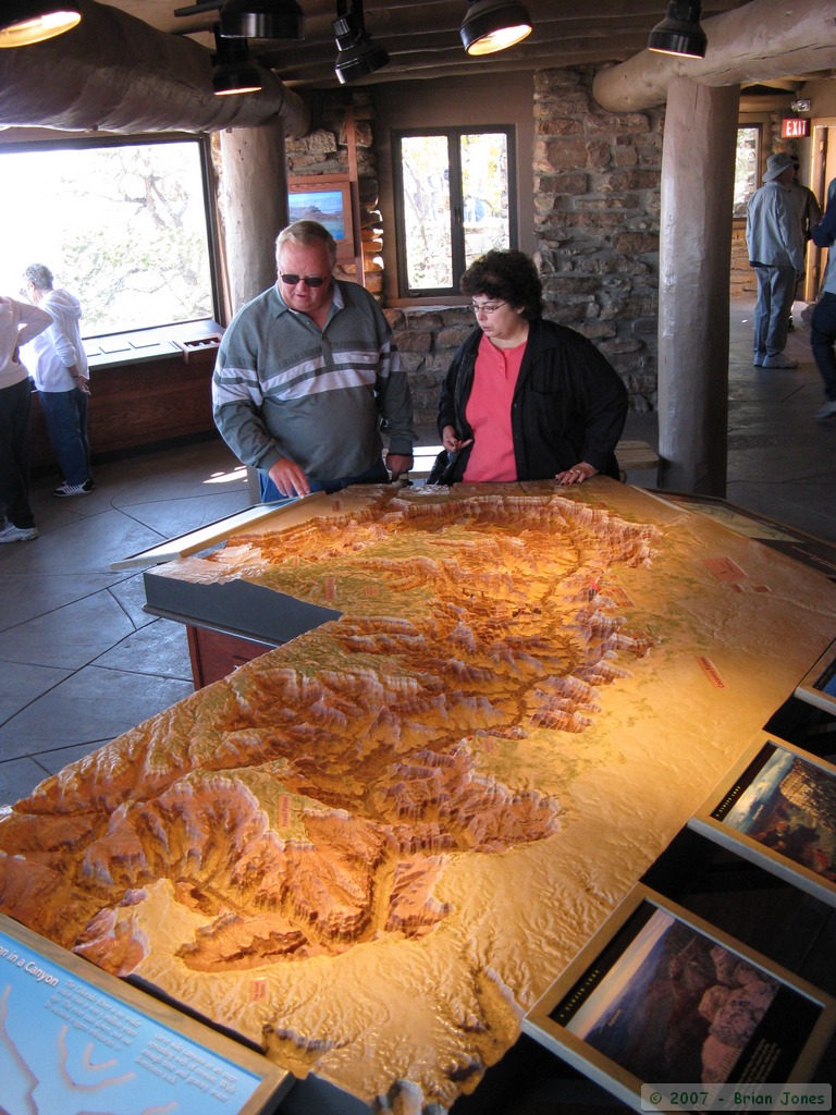 After Hopi House, Marisa and Tina headed home so we said our good-byes. Shan and I continued wander along the rim, heading ultimately to the Kolb Studio. We checked out the exhibit they had on the Havasupai people, then returned to Maswik Lodge to collect our car and drive to Yavapai Observation Station on our way out of the canyon. The observation station located at Yavapai Point has a commanding view of the canyon, but what interested me most was a three dimensional model of the Grand Canyon. I roughly traced our backpacking route on the model, which imparted a very powerful impression of the size of the canyon and how tiny the area we covered was. The model was perhaps 12 feet long and 5 feet wide, but the entire area we covered on our hike was about the size of my palm. One could truly spend a lifetime exploring the canyon and not see the half of it.