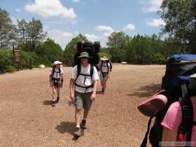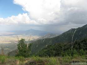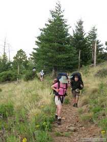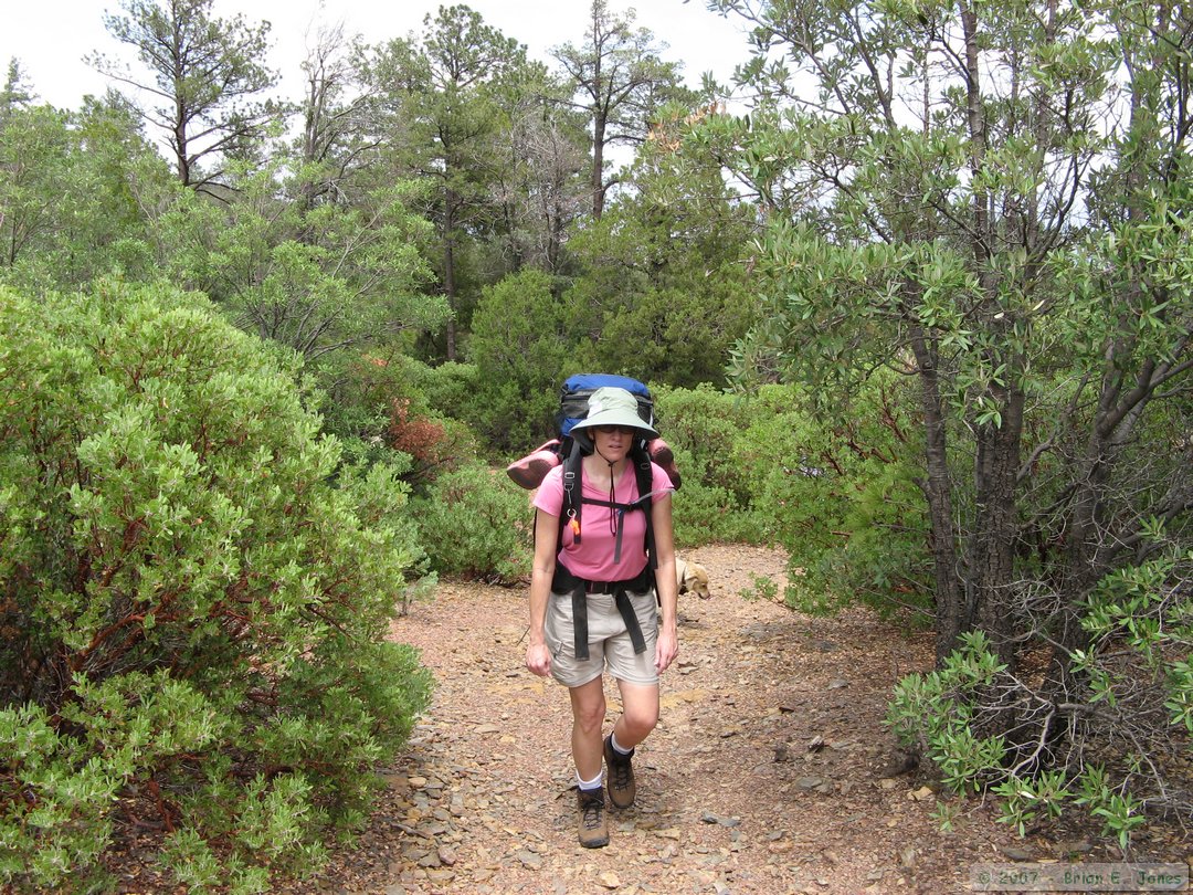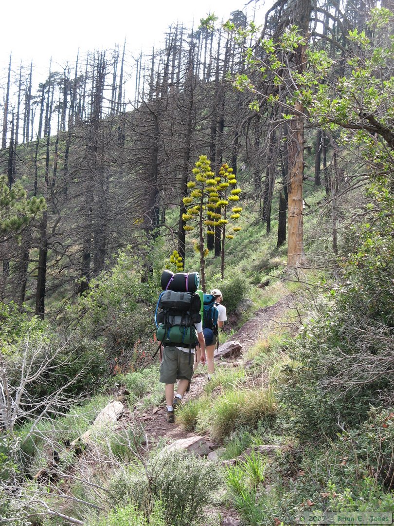 Brian and Marisa returned at around ten o'clock, and we headed down to Sierra Vista, where we ate a quick lunch before continuing on to the trailhead for the Carr Peak Trail. As we hoisted our packs to start the hike, the sky appeared as though it might bring some rain down upon us before we reached camp. Sure enough, a mile or so up the mountain, it started to rain lightly. It didn't last long though, and most of us soon removed our rain gear to stay cool.