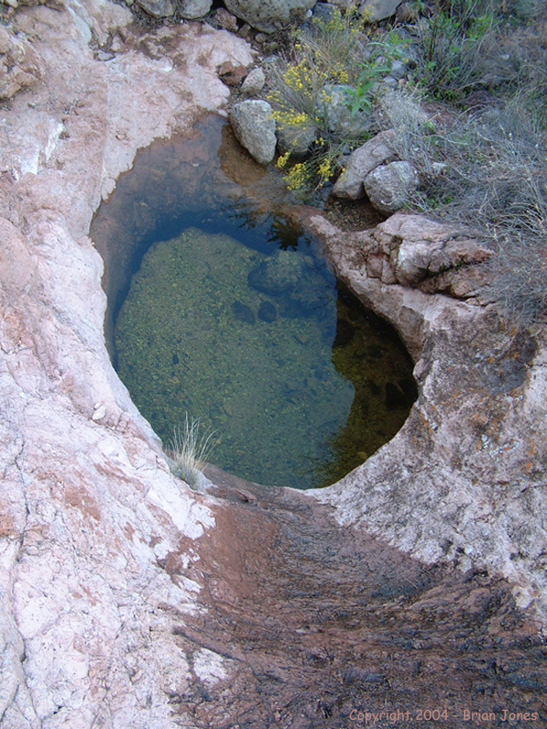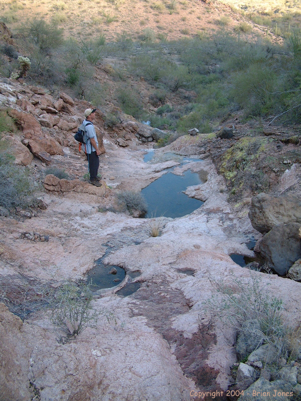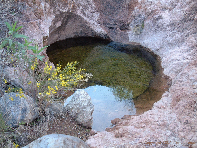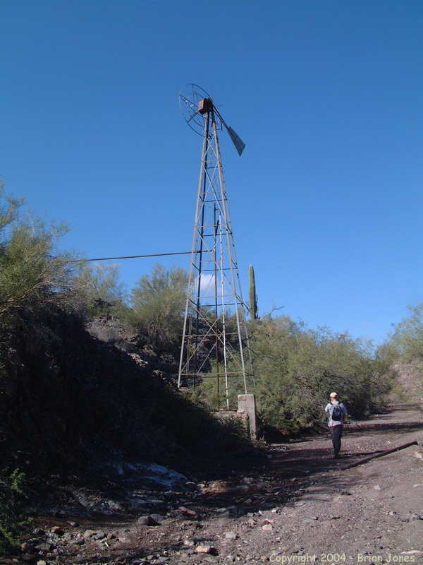 After about 2.5 miles we came to Hummingbird Springs, which is easy to find because it is marked by a corral and a windmill. The base of the windmill is down in the wash, and when we checked it out we discovered that there was quite a bit of water in the basin. We couldn't tell how fresh the water might or might not be, but I definitely wouldn't drink it without filtering it. Since I didn't see any evidence of water escaping from the concrete basin, I can only imagine that the water doesn't get recycled often and probably isn't very clean because of that. I should also note that with the recent rains there was a fair amount of water to be found throughout the wilderness area where boulders or bedrock form natural bowls. Again, I wouldn't rely on these as a source of water, but if you go during a rainy period, I imagine you could be reasonably sure of having at least emergency water.