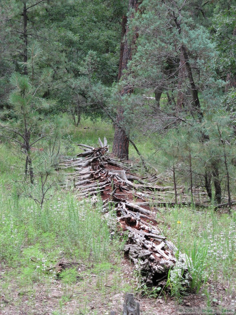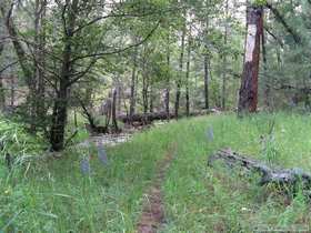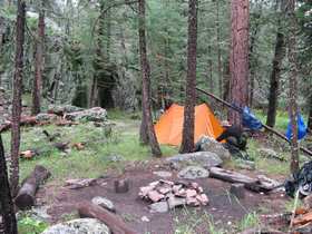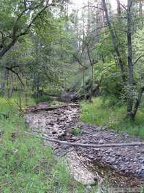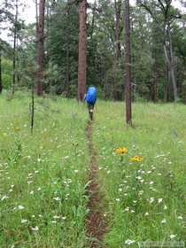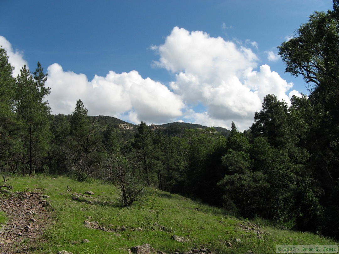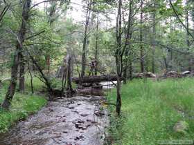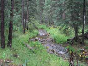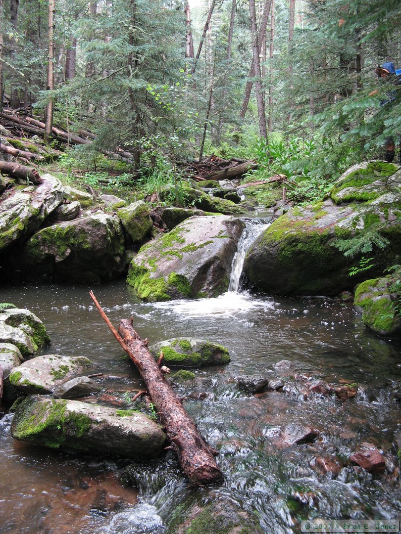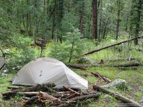 Just after arriving at the confluence, the rain slowed enough to allow us to set our tents up without getting our gear wet. We had a quick bite to eat, then decided to hike up the south fork of the Mimbres River in hopes of making it to Mimbres Lake. We took our food in case we didn't get back to camp by dinner time, and I opted to take my spare clothes in case it stopped raining and I wanted to get dry. It didn't take long for me to question whether or not we would make it all the way to Mimbres Lake, over five miles away. The trail along the south fork was less distinct than the trail below the confluence, which slowed our progress. Shortly after resuming our hiking, the rain picked up too. We just resolved to keep up a good pace without moving too quickly to enjoy what we were hiking through.
