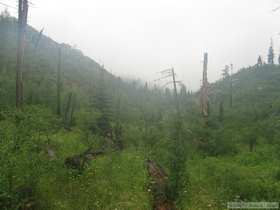 After a while, we entered a large open area created by a long-ago forest fire. A fire ecologist friend of mine has since told me that we were likely in the area burned by the McKnight fire of 1950.