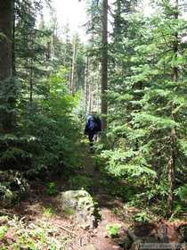 The weather was warm enough that donning rain gear would promote sweating profusely, so we both opted to protect our packs but not our bodies from the rain. Quite frankly, I expected a short shower followed by a nice drying sun. A false hope, to be sure. It rained to varying degrees of severity the rest of the morning and clear through the afternoon.