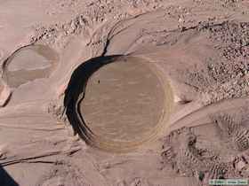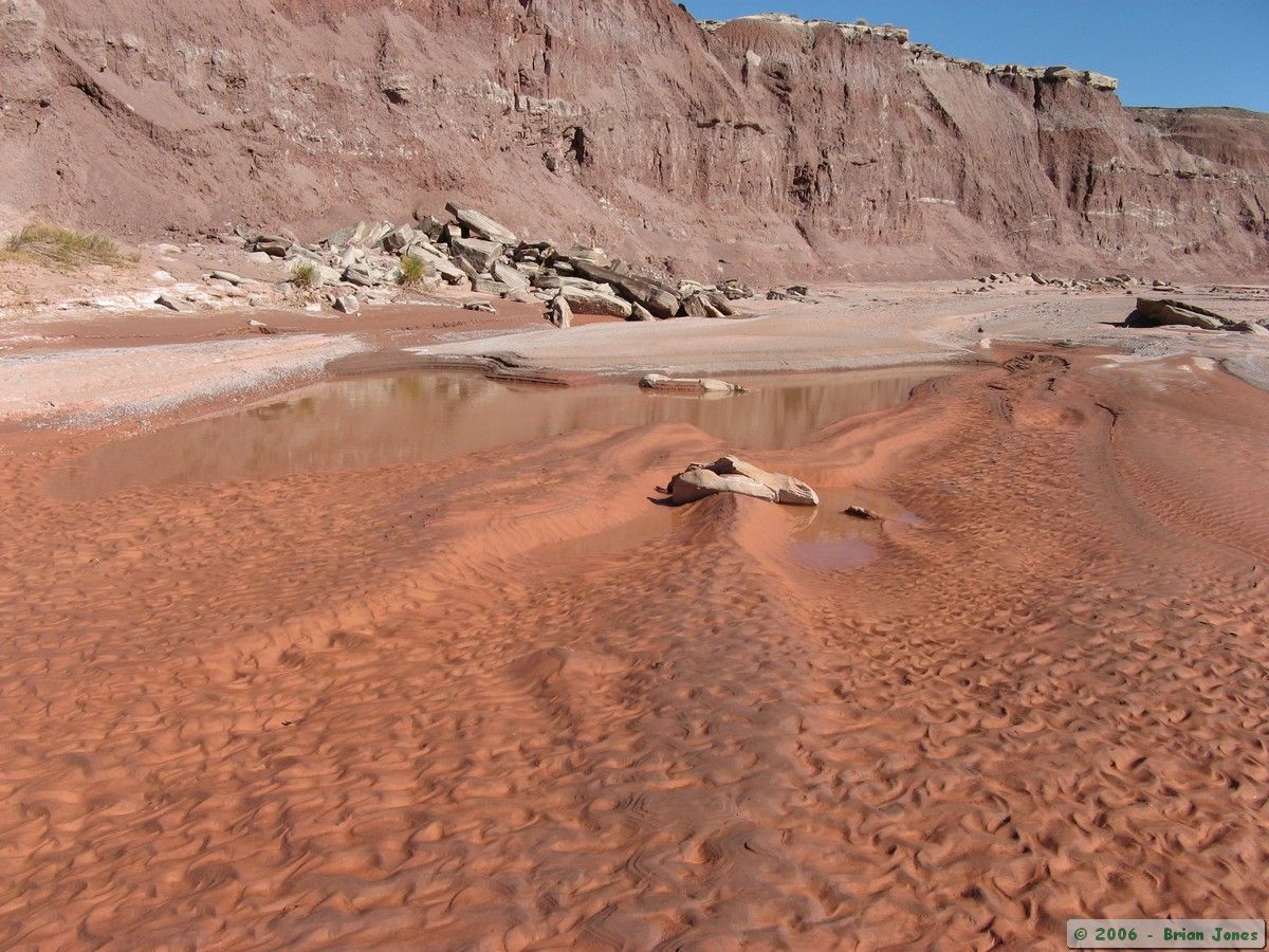 We found out later that the area had received a substantial rain a week and a half prior. It was evident that Lithodendron Wash had been flowing quite heavily at that time based on some key flood indicators I noticed. It appeared as though the wash had been flowing several feet deep; a rather significant amount of water for a wash that is often 100 feet or more across and for one in such a dry land. Though it would be fantastic to see the wash in flood stage, I know that I wouldn't want to be hiking out there when it's wet. The soils within much of the National Park are composed of fine silts and clays, often of the sticky, expanding/contracting kind. When wet, they are best avoided, or you will soon find your boots caked with some 10 pounds of mud a piece. I tested some of the mud, and a single light foot step could easily accumulate an inch or more of mud on the bottom of my boot when raised up. The silts and clays helped keep the pools of water from infiltrating, which I'm sure the animals appreciate, if they dare get close enough to them. I didn't actually notice many tracks leading up to the pools. Perhaps the animals have learned to be wary of the soft ground around the pools. Certainly, even beyond the mud, quicksand is a definite possibility as well.