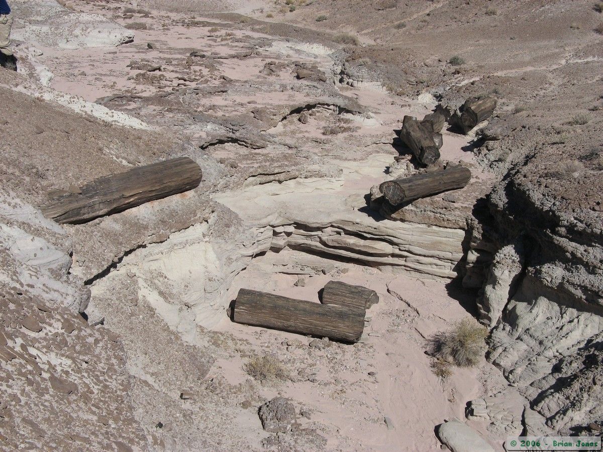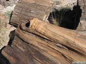 After emptying my pack once more to check for a leak and let the pack dry out a bit, Steve and I wandered around the area trying to investigate the mystery of the disappearing bridge, and found a more likely candidate, though it wasn't a bridge either. What we found was at least onyx colored, and there were two portions of it sticking out of opposite banks of the wash, with a huge section missing in the middle over the wash itself. My only guess is that the log was once intact and did indeed form a bridge. The center section of the log is laying in the wash below where it must have once been suspended.