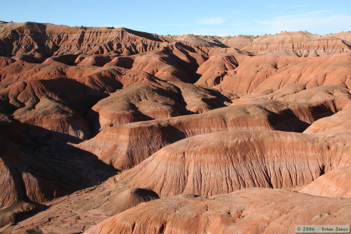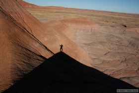 We still had some daylight left after setting up camp, so set out to explore Chinle Mesa. Upon reaching the mesa, we quickly realized that our plan wouldn't be as straight-forward as anticipated. The base of Chinle Mesa is a steeply sloped, heavily eroded, treacherously surfaced badland, the scaling of which would require careful consideration and even more carefully planned foot steps.