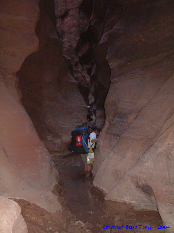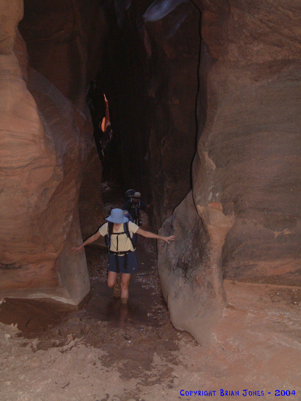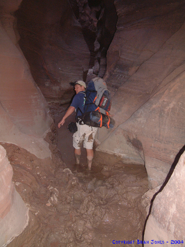 That is, until we reached the next obstacle. When I hiked part of Buckskin Gulch a number of years ago, I remember there being water in pools throughout the canyon, some were up to thigh deep, but most were pretty shallow. All were murky but solid. When the ranger told us to expect water in Buckskin up to knee deep, I didn't think too much of it. Knee deep water is no big deal, even if it is a bit chilly. Not so with what lay ahead of us now. What we encountered was a bona fide mud pit. Going through the mud would slow us down, but we certainly couldn't camp where we were, so we navigated the mud pit. And the next one. And the next one. They ranged in consistency from milkshake to thick sandal sucking muck. Personally, I didn't find them to be all that cold, but Jeff and (especially) Shannon did. Shannon's mood was going downhill fast. Ice cold (to her) mud pits were not doing anything to ease her fears of getting caught on the trail after dark with no place to camp.