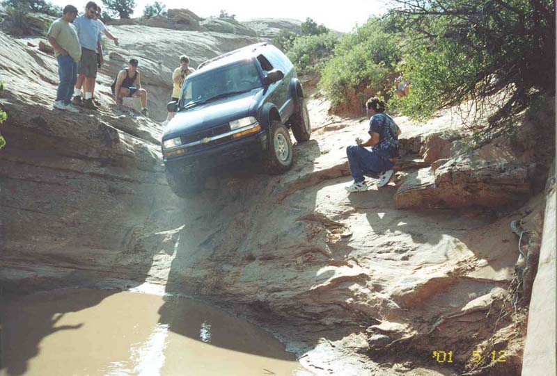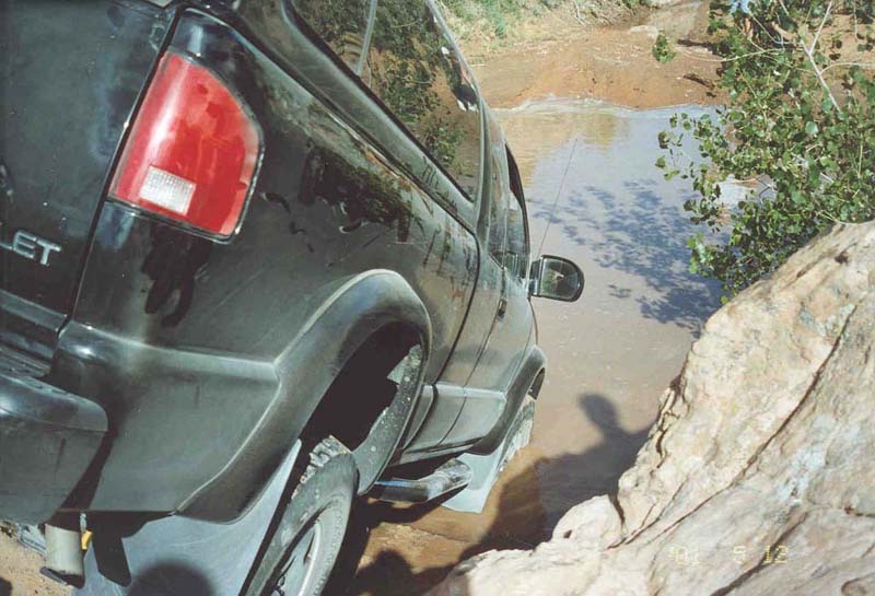 Randy followed Rich with his lifted BlaZeR2 with 33" tires. He too, got down unscathed. When we started the descent down the slot, I wasn't sure how many people would try it, since most people were driving stock vehicles, most people have an aversion to body damage, and the waterfall certainly presented an opportunity for the later. I was surprised to see all but Steve Spangler and Erik line up to tackle the obstacle. One by one, we spotted everyone through the waterfall.