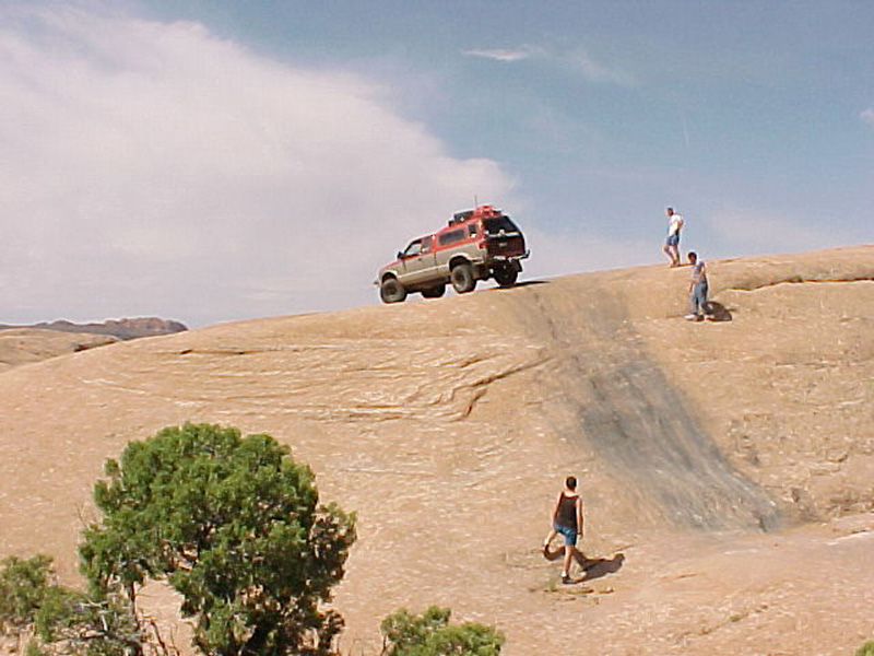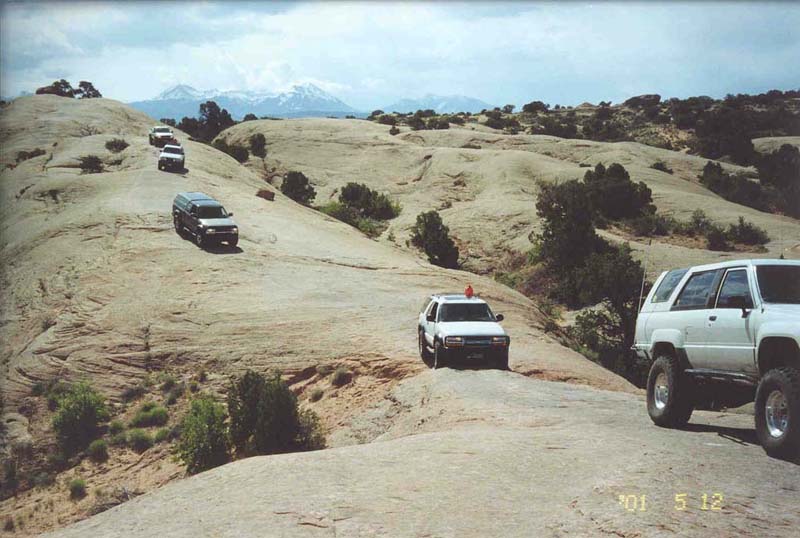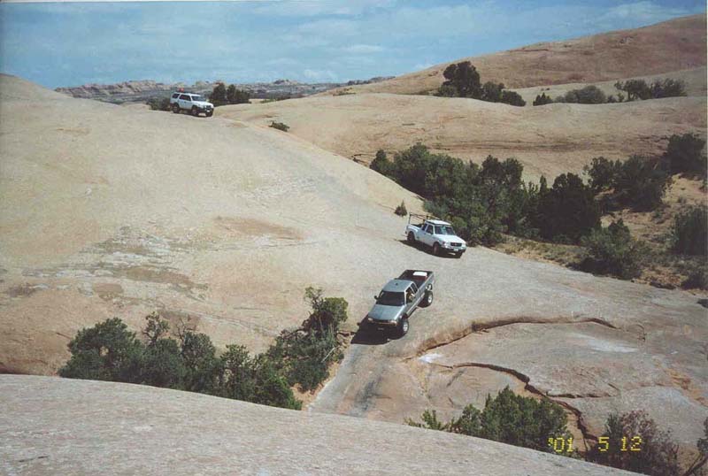 Sunday was the day of the big group run. It was the only trail that everyone who made it to ZafaRi2001 went on. We started at 8 o'clock Sunday morning and started the short drive down Sand Flats Road to the start of Fins & Things trail. We actually started the trail somewhere in the middle near the radio tower, trying to find the infamous Exhaust Bender Rock. EBR thwarted me last year, not even allowing my rear tires to get close to the base of it's extreme climb. EBR ate Steve Spangler's exhaust pipe when he failed to get up it (hence the nickname of the obstacle). Only Dave was able to conquer EBR last year. This year, I was determined to climb EBR. It would take us a while to reach it though, as we took a left turn instead of a right turn at a critical junction and ended up in a different area. The left turn took us to an area we had never been to before. We climbed up over a fin, and when we got on top, we had to get out and investigate. The trail led down the fin, into a slot, down a (dry) waterfall into a largish mud hole and down a wash. After some discussion, I decided to go for it. With the aid of a good spotter (Rich), the descent down the waterfall into and through the mud hole went smoothly. Rich followed, his lifted Jeep with 35's making the descent look safer and easier.