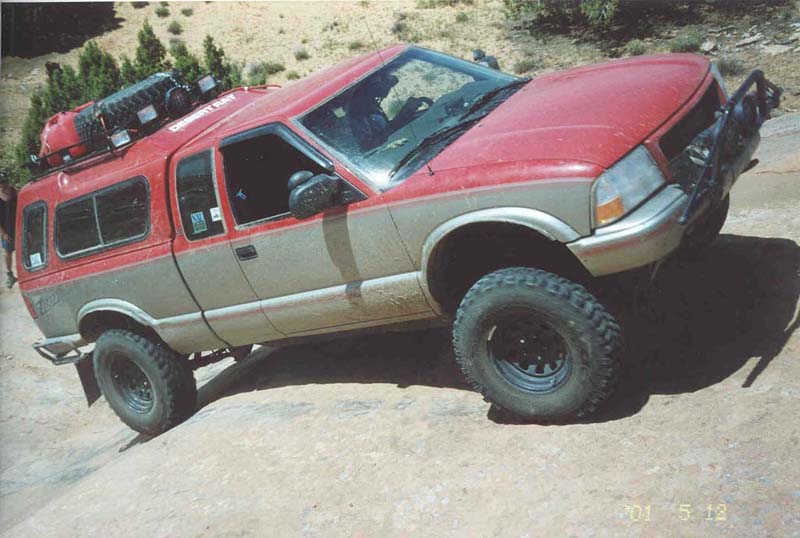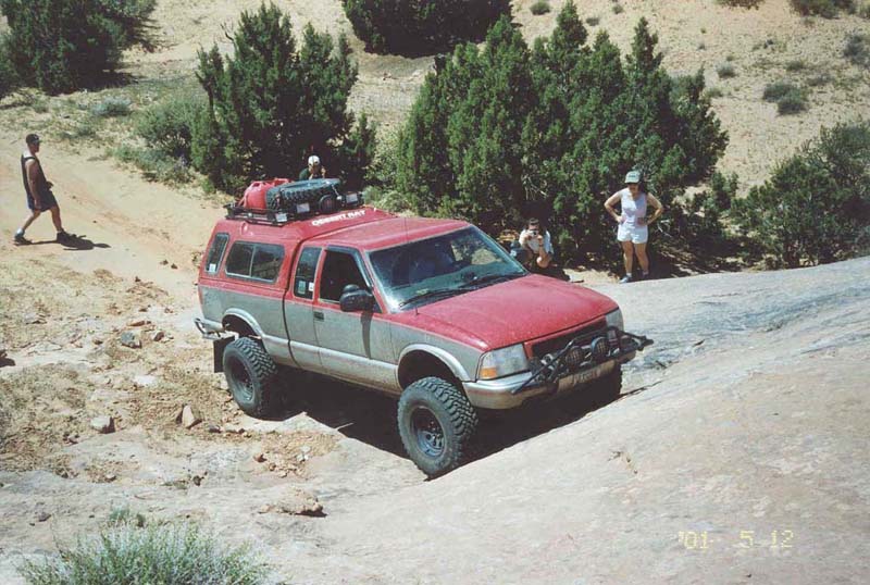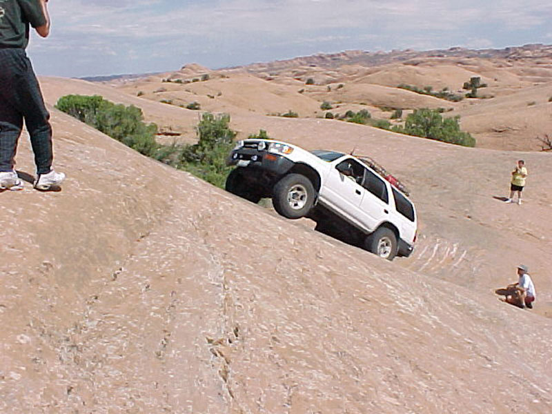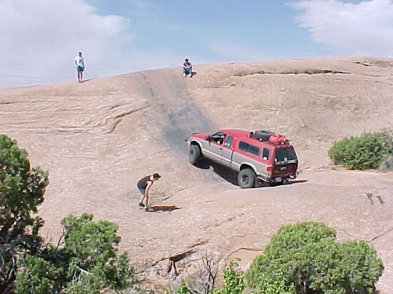 My first two attempts were without the aid of a spotter except for Steve Smith making sure my departure angle was good enough. I didn't have any problems there, but I was losing traction early on in the ascent. After that, Steve, Rich and I decided that a line further to the right would be better, telling myself and the group that this would be my last attempt. I had no desire to break my truck. I started the climb and made it quite a bit further up the rock but started hopping the front end so bad that I let off the gas . . . at just the wrong time. Just as I let off the gas, I crested the rise a bit and started getting some more traction. But I couldn't correct fast enough and put the power down again, so I stomped on the brakes and slid quickly and precariously down the steep incline to the bottom.