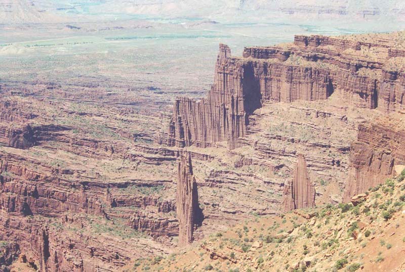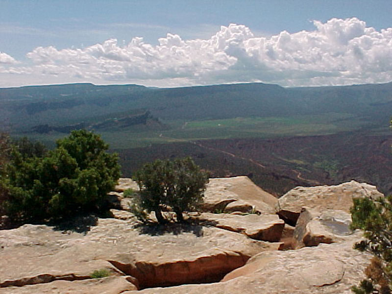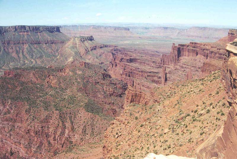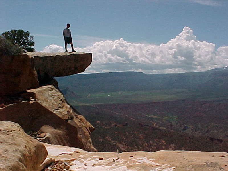 From the Dewey Bridge, Entrada Bluffs Road heads south to the start of Top of the World Trail. Entrada Bluffs Road took us by some interesting sandstone formations. The best was yet to come though. After about 5 miles on Entrada Bluffs Road, we started climbing up Top of the World proper, and the road got more interesting. At one point, we got a good view of where we had just come from, but the best was still yet to come. There were some ledges to negotiate on the trail, but nothing terribly difficult, and the entire group wound it's way up to the top of the trail without problems. A small group of us must have been more anxious than most to reach the end of the trail, because we arrived about 10 minutes ahead of everyone else. I'm glad we got that extra 10 minutes!